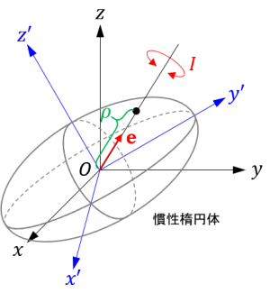 座標系 \(O-x^{\prime}y^{\prime}z^{\prime}\) を慣性主軸と一致するように取れば、この座標系による慣性楕円体面の方程式は